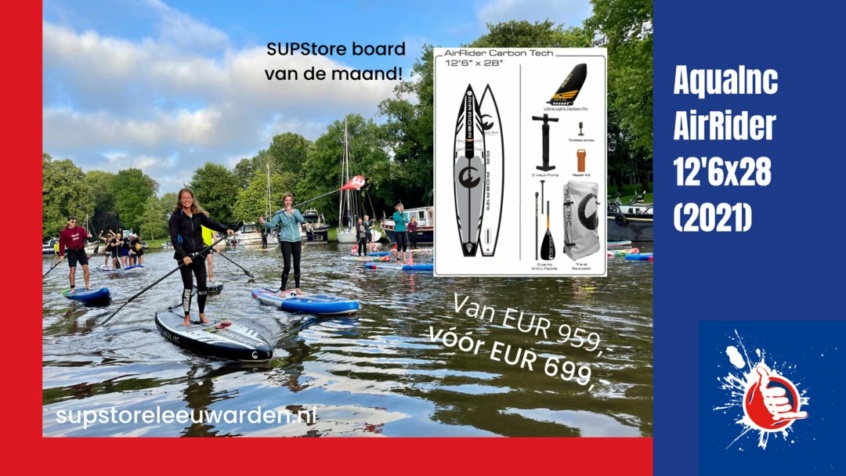 In april 2022 bieden wij de inflatable AquaInc AirRider 12’8×28 (package 2021) aan voor de super scherpe prijs van EUR 699,= (was EUR 959,=).